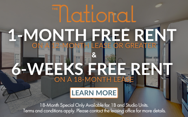 Our luxury Old City Philadelphia apartments combine the historic charm and classic finishes abundant in the neighborhood with modern amenities and luxurious interiors. At the National you'll find pet-friendly studio, one-, and two-bedroom rentals. Each apartment offers exceptional boutique-style finishes as well as dramatic views of both Center City and the Delaware River. The National is a magnificent apartment building in Old City, Philadelphia, providing its residents with top-notch amenities, such as a rooftop deck with an outdoor fireplace and dining area, fitness center, media room, and bicycle storage to make getting around the city easy.